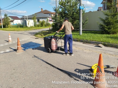 Внимание, на территории Союза "Марусин сад" ведутся работы по ремонту дорог коттеджного посёлка "Марусин сад". Проводится герметизации горячим битумом швов дорожного полотна.